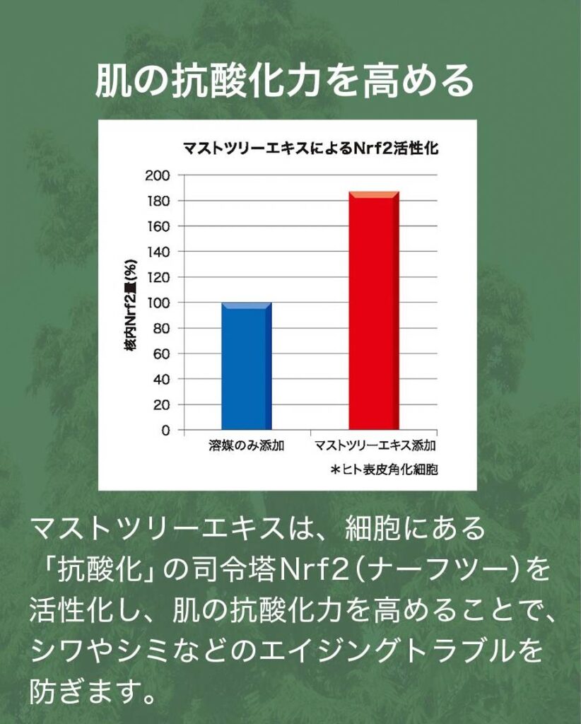 ※マストツリーエキスは2014年12月25日に横浜市立大学との共同研究により、マストツリーから抽出したエキスに抗酸化作用を見出し、特許(特許第5463667号)を取得しました。