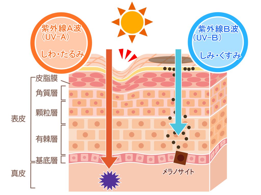 肌の深部(コラーゲンなどがある真皮層)まで到達しシワやたるみの要因となるUVA波。